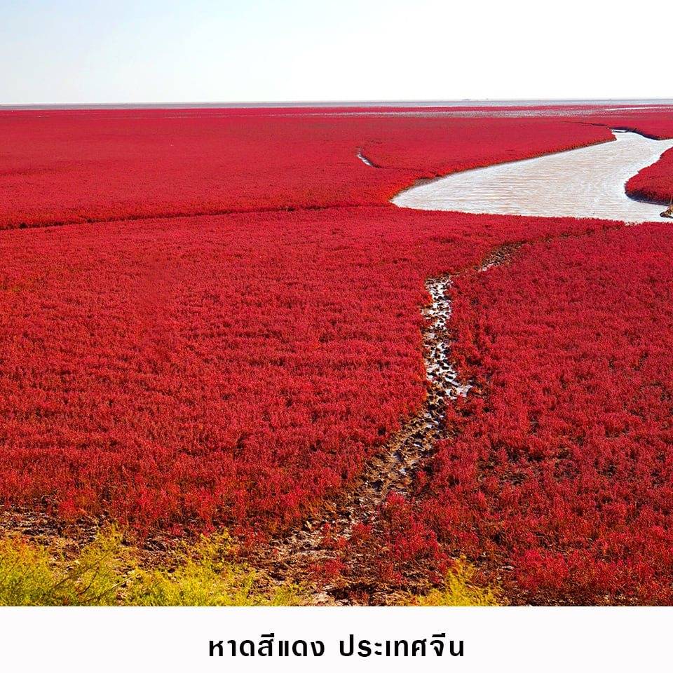 “หาดสีแดง” นั้นเป็นสถานที่ท่องเที่ยวที่อยู่ในเมืองผานจิ่น ในมณฑลเหลียวหนิง ประเทศจีน ซึ่งสีแดงของ Red Beach เกิดขึ้นจากสาหร่ายชนิดหนึ่งที่เติบโตได้ดีในดินเค็มมองไปทางไหนก็จะเห็นสาหร่ายสีแดงเข้มนี้ไกลสุดลูกหูลูกตา จึงไม่แปลกใจเลยว่าทำไม Red Beach ถึงได้ตำแหน่งบึงหนองที่ใหญ่ที่สุดของโลกไปครอง