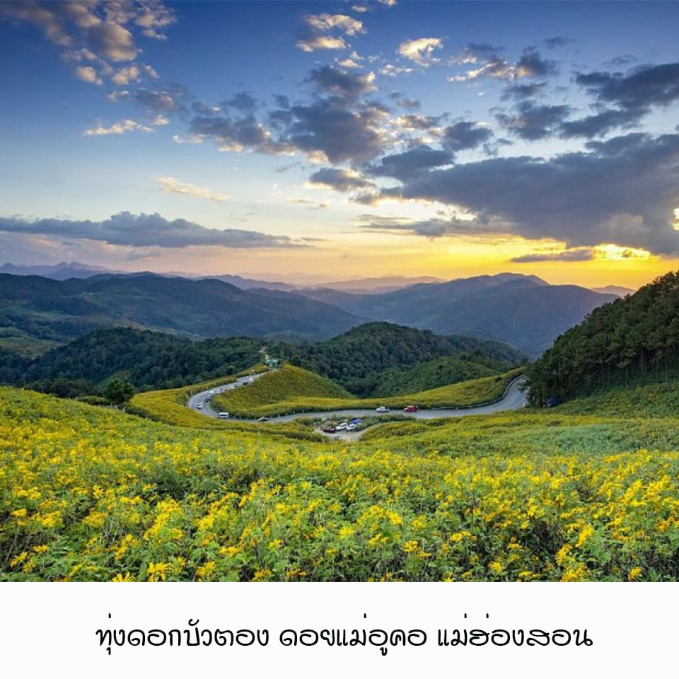 เส้นทางที่มีรถสัญจร ขนาบข้างด้วยสีเหลืองสดใสของดอกบัวตองที่บานสะพรั่งปกคลุมเทือกเขา หากใครได้มาแถวนี้อย่าลืมแวะชมทุ่งดอกบัวตองที่ใหญ่ที่สุดในประเทศไทย มีพื้นที่ประมาณ 1,000 ไร่ เป็นหนึ่งในสถานที่ท่องเที่ยวยอดฮิตของจังหวัดแม่ฮ่องสอน ด้วยลักษณะที่เป็นทิวเขาสีเขียวสูงขึ้นสลับกับทุ่งดอกบอกตัวสีเหลือง