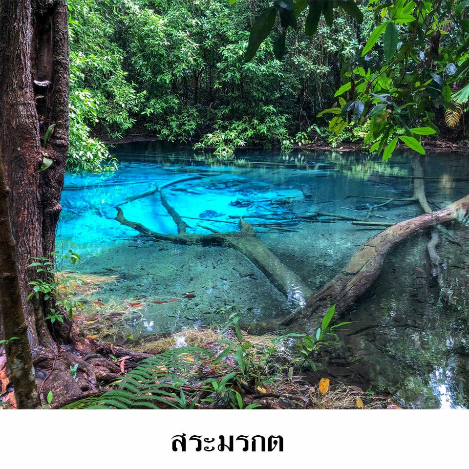 สระมรกต กำเนิดมาจากธารน้ำอุ่น ในผืนป่าที่ราบต่ำภาคใต้ เป็นน้ำพุร้อน มีอุณหภูมิประมาณ30-50 องศาเซลเซียส เป็นสระน้ำสวยใสกลางใจป่า ที่มีน้ำใสเป็นสีเขียวอมฟ้า เปลี่ยนสีไปได้ตามวันเวลาและสภาพแสง สระมรกตกำเนิดมาจากธารน้ำอุ่น ในผืนป่าที่ราบต่ำภาคใต้ เป็นน้ำพุร้อนลักษณะเป็นสระน้ำร้อน 3 สระ ได้แก่ สระแก้ว สระมรกต และ สระน้ำผุด น้ำใสเป็นสีเขียวมรกต มีอุณหภูมิประมาณ 30-50 องศาเซลเซียส รอบ ๆ บริเวณเป็นป่าร่มรื่นเขียวครึ้มมีพรรณไม้ที่น่าสนใจ