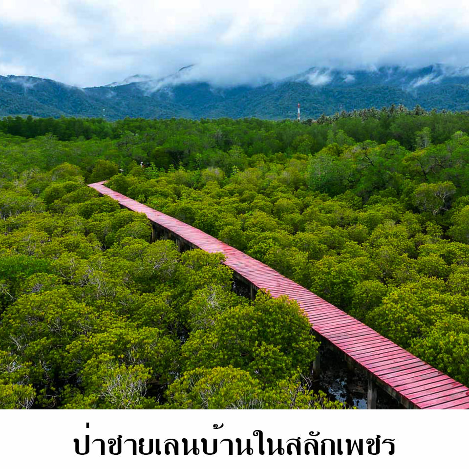 ชื่อเต็มๆ ก็คือ โครงการฟื้นฟูบูรณะป่าชายเลนบ้านสลักเพชร เป็นป่าชายเลนที่สมบูรณ์และสวยที่สุดในเกาะช้าง มีทางให้เราเดินชมธรรมชาติบนสะพานไม้สีแดงสดตัดกับสีเขียวของป่าโกงกาง ทอดยาวไปจนสุดอ่าวสลักเพชร
